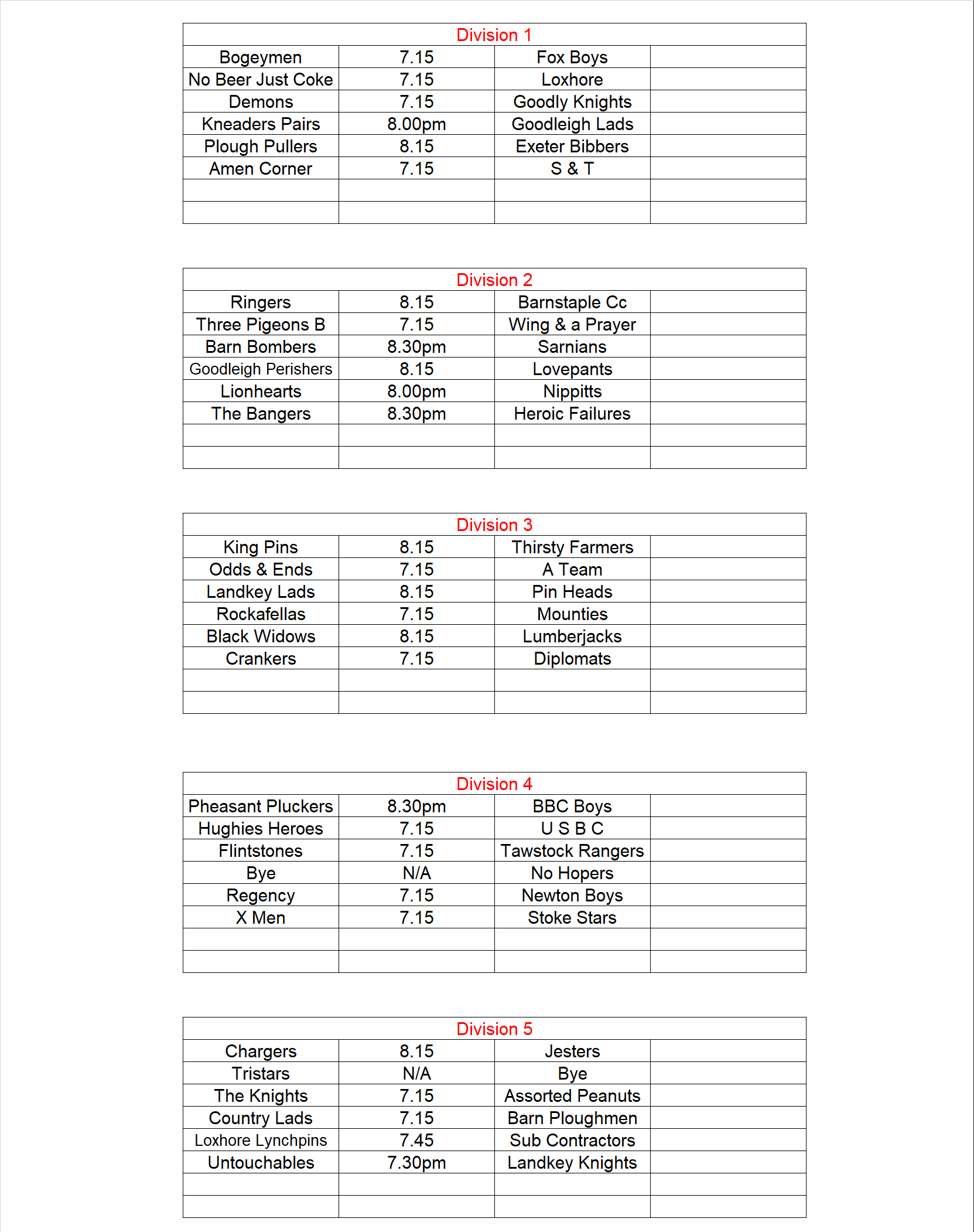 BARNSTAPLE AND DISTRICT MEN'S SKITTLES LEAGUE