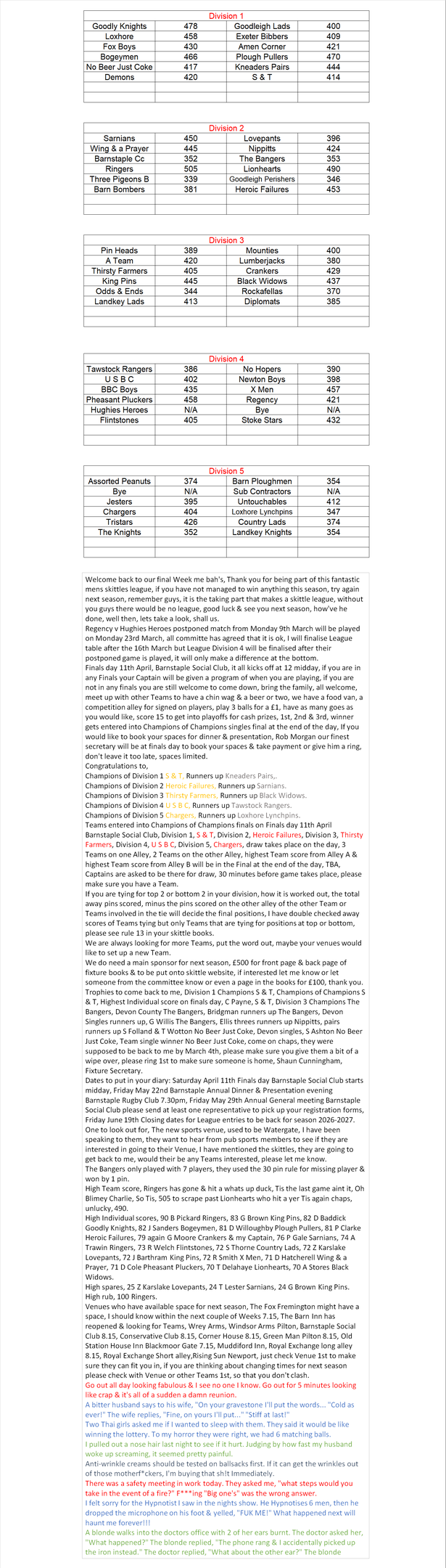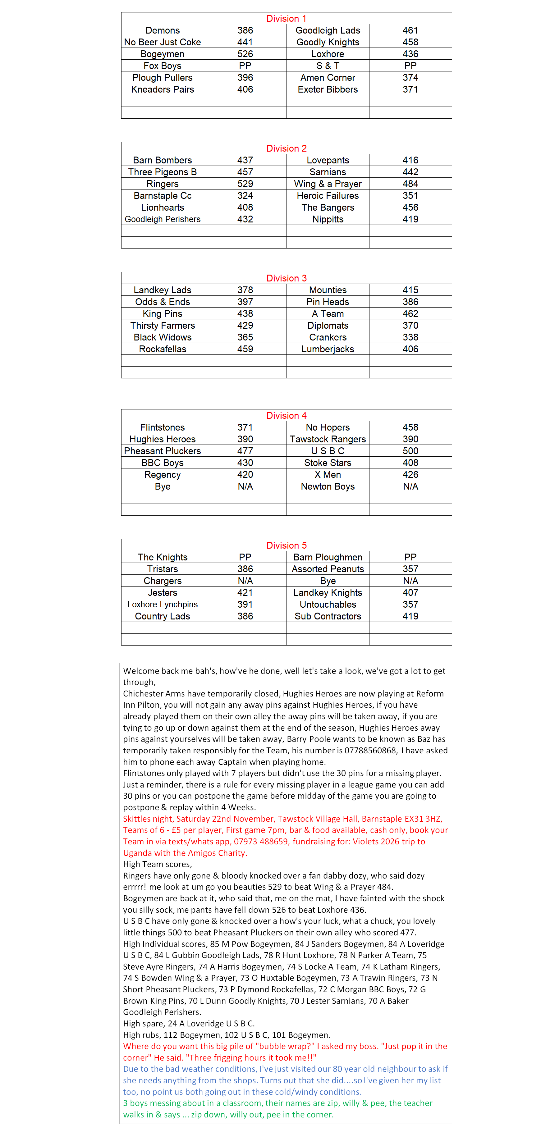 Barnstaple & District Men's Skittles League